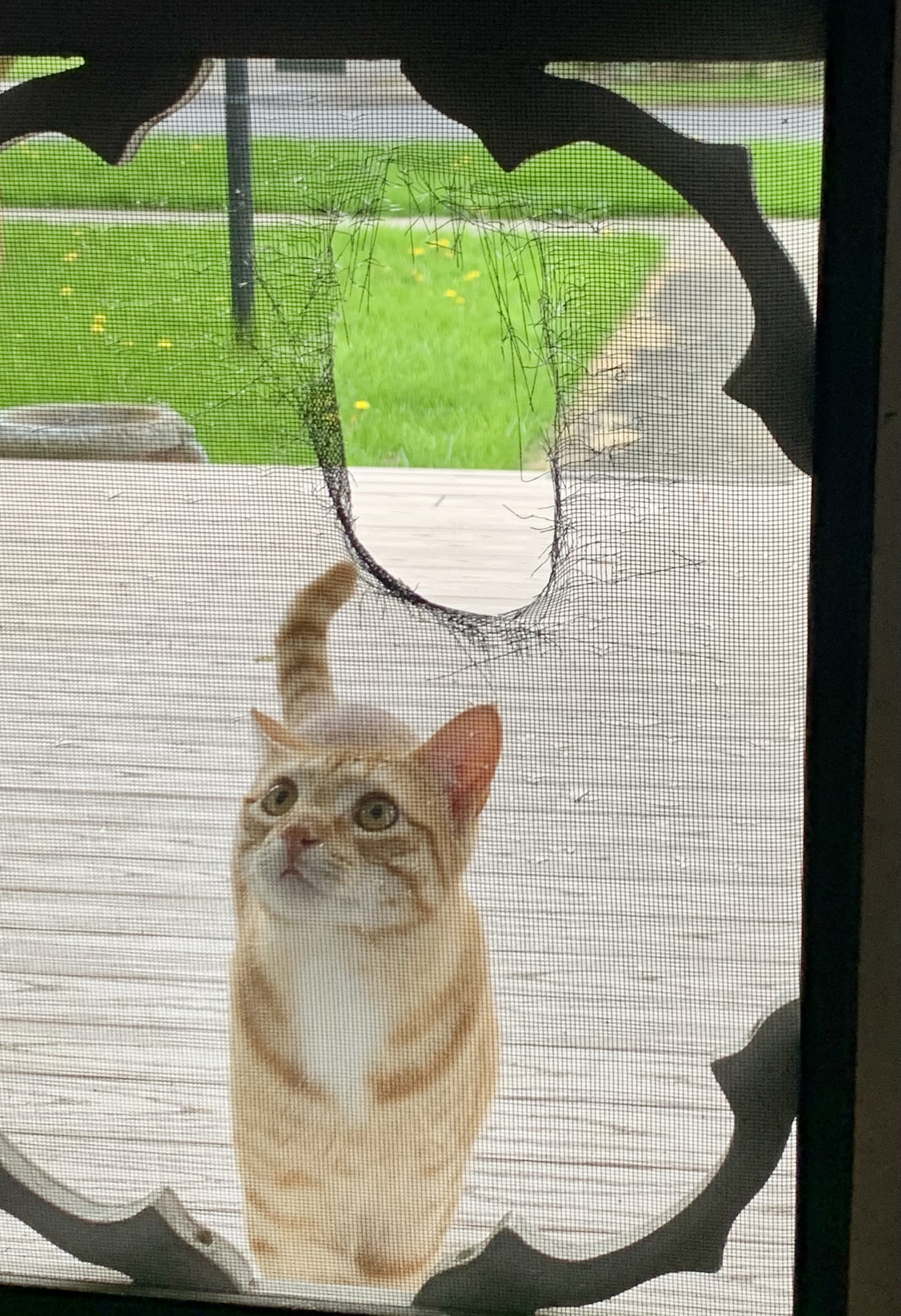 At least one dog is underfoot perpetually, sometimes the neighbor’s dog joins the fray, and there are five cats milling about, twining between ankles and asking to go in and out and in and out. They got so sick of waiting for someone to let them in and out that one of them (affectionately nicknamed Le Shittén) ripped her own cat door through the screen door that they all happily now use.