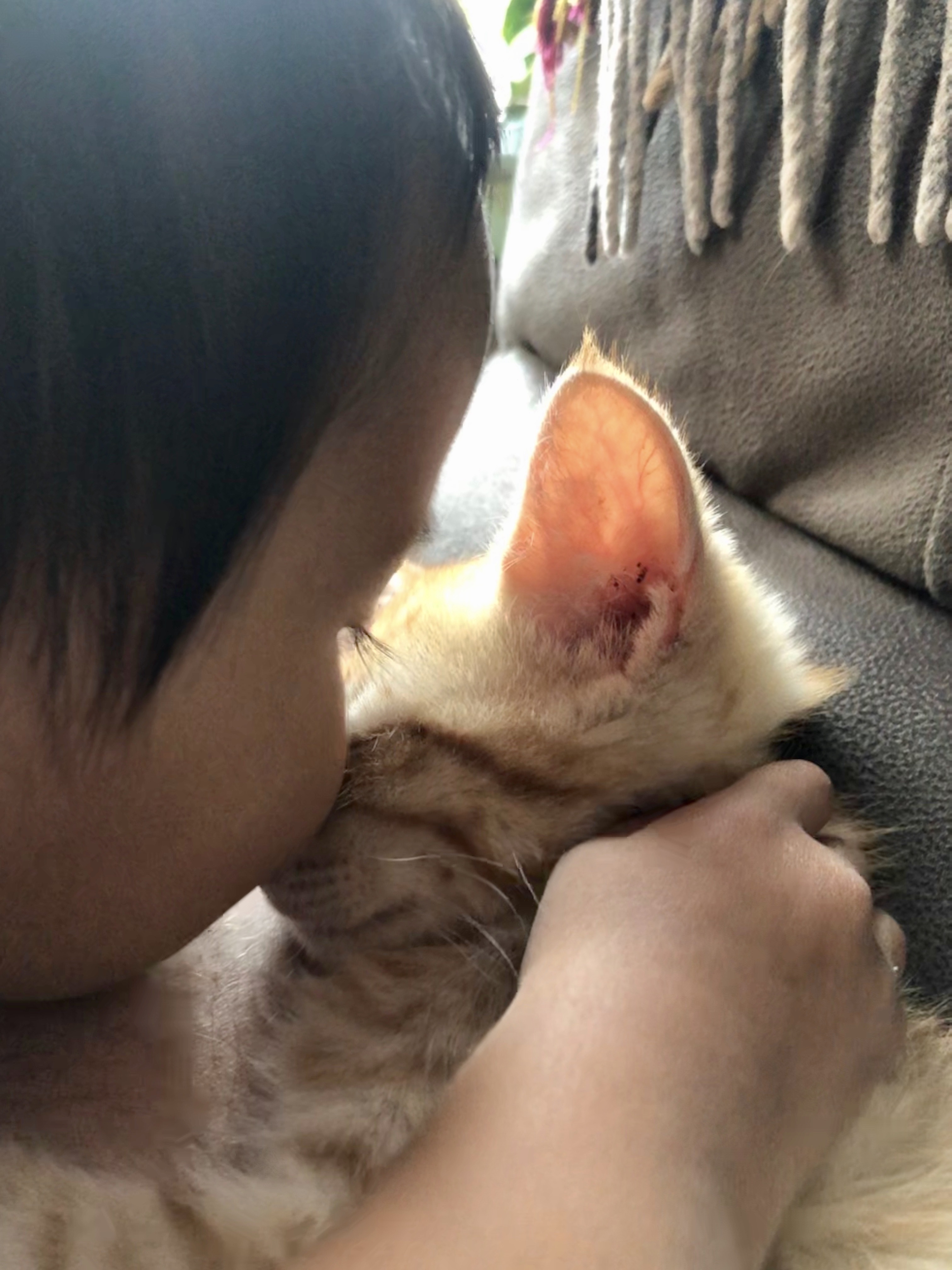 It started with Pippin, one of Seth’s “waltzed in” cats. Little Mouse LOVED Pippin, and it was mutual. When she was a baby he’d snuggle up and nap with her and clean her little bald head. She’d fall asleep with her fingers tangled in his shaggy fur.