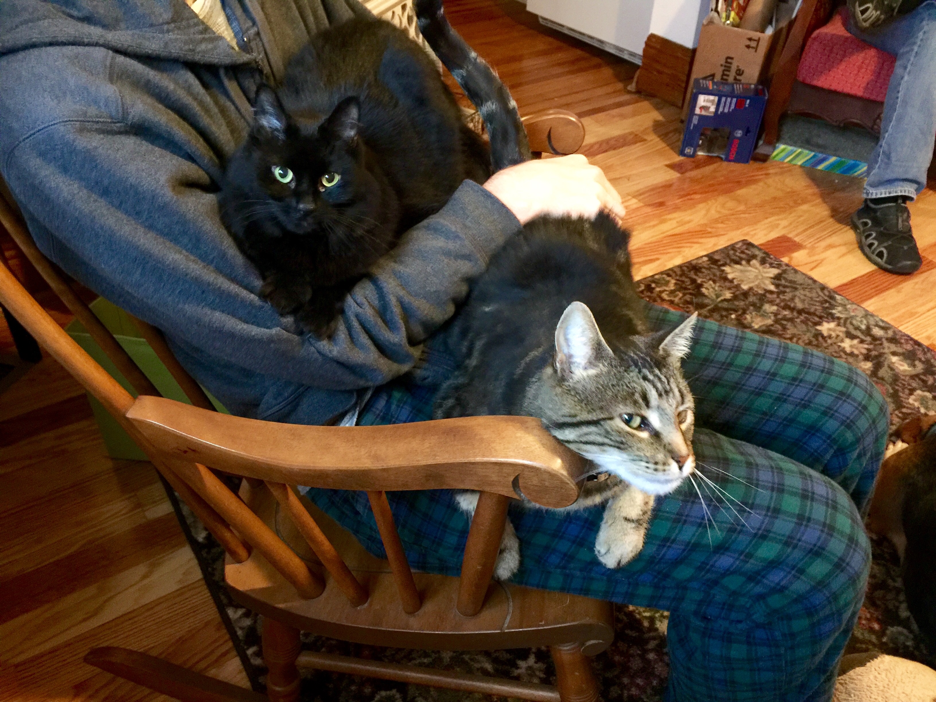 Three of our cats, Sneakers, Rocky, and Wednesday, basically want nothing to do with the children. They’re adept at slinking underneath outstretched little hands and dashing off to do their own catly things.