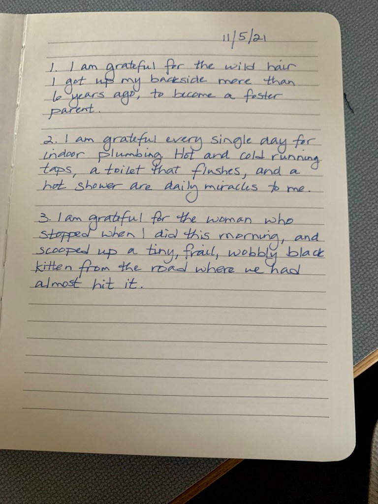 3. I am grateful for the woman who stopped when I did this morning, and scooped up a tiny, frail, wobbly black kitten from the road where we had almost hit it. I don’t need a 7th cat. Really. I don’t. I love my lunatic animals – all 6 cats and 2 guinea pigs. I love them hard, especially the most recent addition to the family who just up and moved in one day. But I can’t afford more! And have trouble keeping track of the ones I already have. Seth mutters about having to clean guinea pig cage and litter boxes, while I guiltily thank him for doing it. That’ll be a future gratitude… that my husband scoops all the poop!