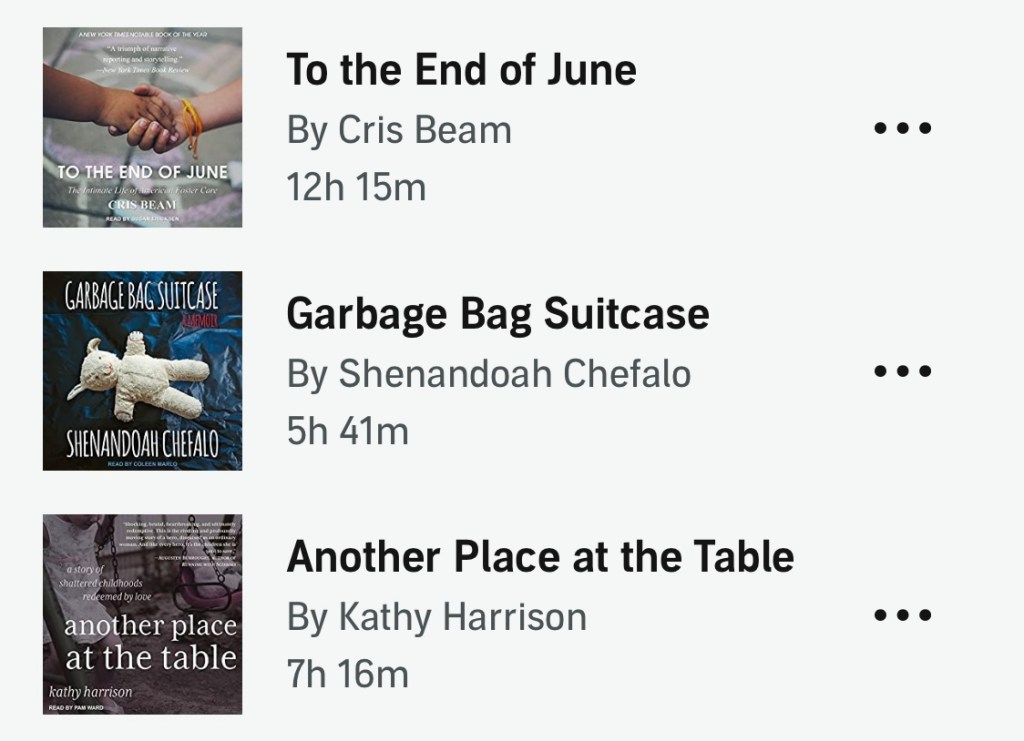 Second, since we take in special rate medical kids, we have to provide documentation that we have engaged in at least 5 hours of special training annually. Only foster homes that take special rate kids need to do this piece. For some folks it’s a struggle to get the training hours done, but for Seth and me it’s a cinch. Seth’s pediatric CPR training counts, as did his class on child development in nursing school. Many of my trainings for being an Attorney for the Child count (topics were things like trauma informed interview tactics, the Indian Child Welfare Act, and domestic violence’s impacts on families). Plus I’m an avid reader/listener to books and like a lot of autobiographies by/about foster parents and former foster youth. My recent Audible titles include these three books all on the topic: