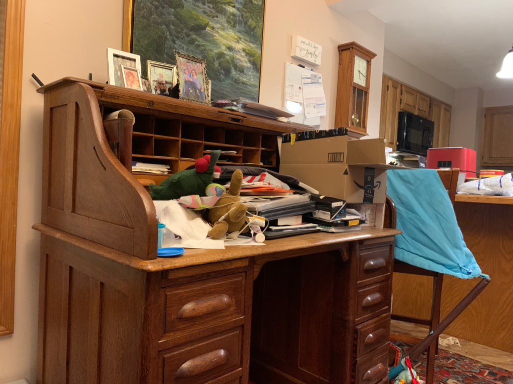 Most of the room was taken up by a mammoth roll top desk that had been gifted to me years ago. It was a gorgeous piece, but was too big for our little Victorian era rooms. Whatever room it was in was dominated by it. And worse, no one ever sat at it and used it. It was just a collecting spot for old mail and random odds and ends. You could never see the top of it. It was perpetually ridiculously messy.
