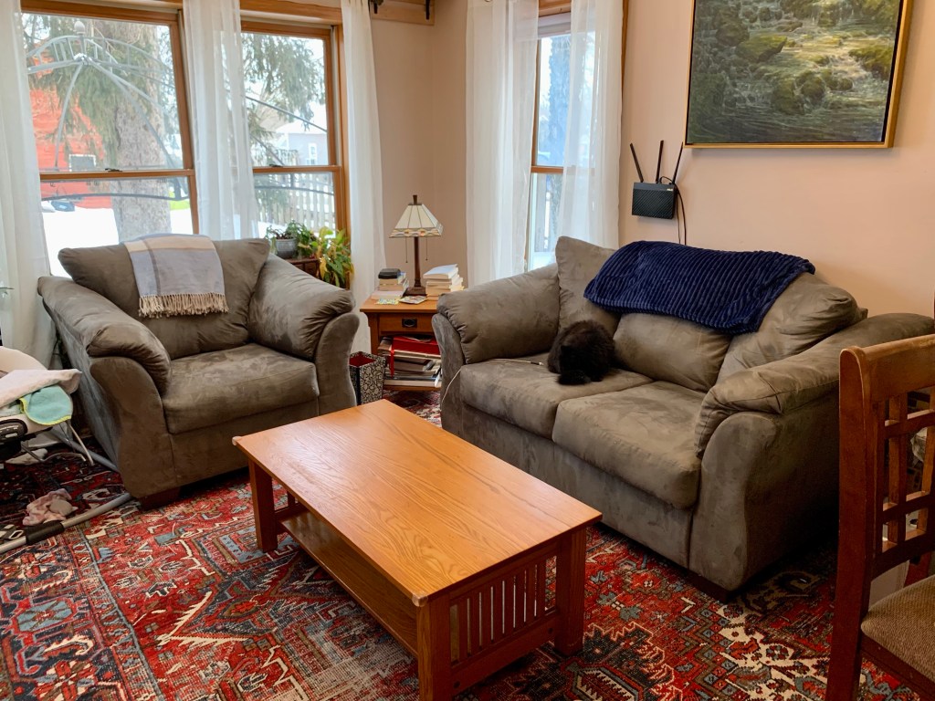 So then I started surfing furniture store sales and Amazon and Jo Ann Fabrics and a few other random stores. I found new curtains, new loveseat and chair, and a new shelving unit to hold the few items we needed to keep from the desk. We got my Mom’s old coffee table out of the attic (we’d put it away to protect it from kids 6 years ago). And I went to town sorting, organizing, trashing, and donating. I listed a bunch of stuff on our local “Buy Nothing” site, and donated an entire car load of stuff we don’t need, don’t use, and don’t want.