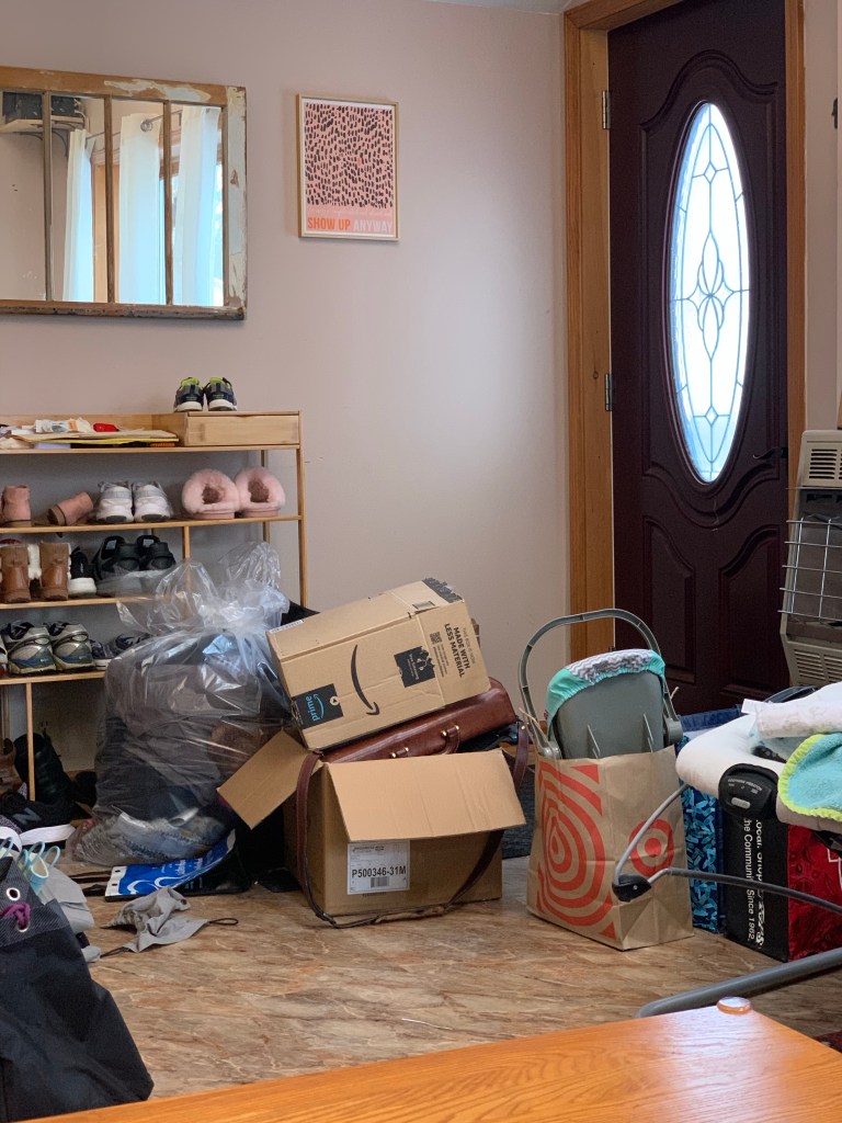 I used to sit in the back room, where we had an oversized rocker recliner that I had claimed as my own. But the whole room was just a space for collecting crap: recycling waiting to go outside, boxes waiting to be broken down, mail, shopping bags, coats, toys. It was insane.
