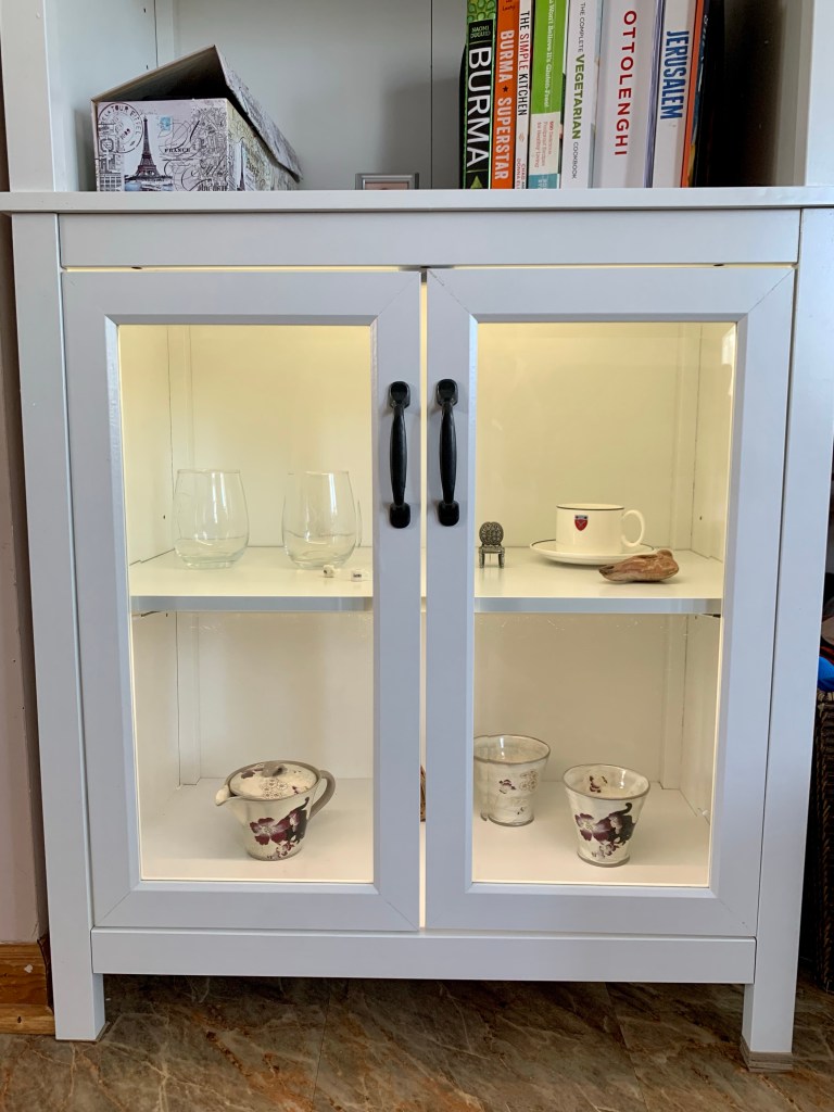 Seth assembled the new shelving unit and tinkered with it to install lighting in the display cabinet portion of it. Now I have my favorite items in a dust free lit space so they can be seen, and yet keep small fingers off them.