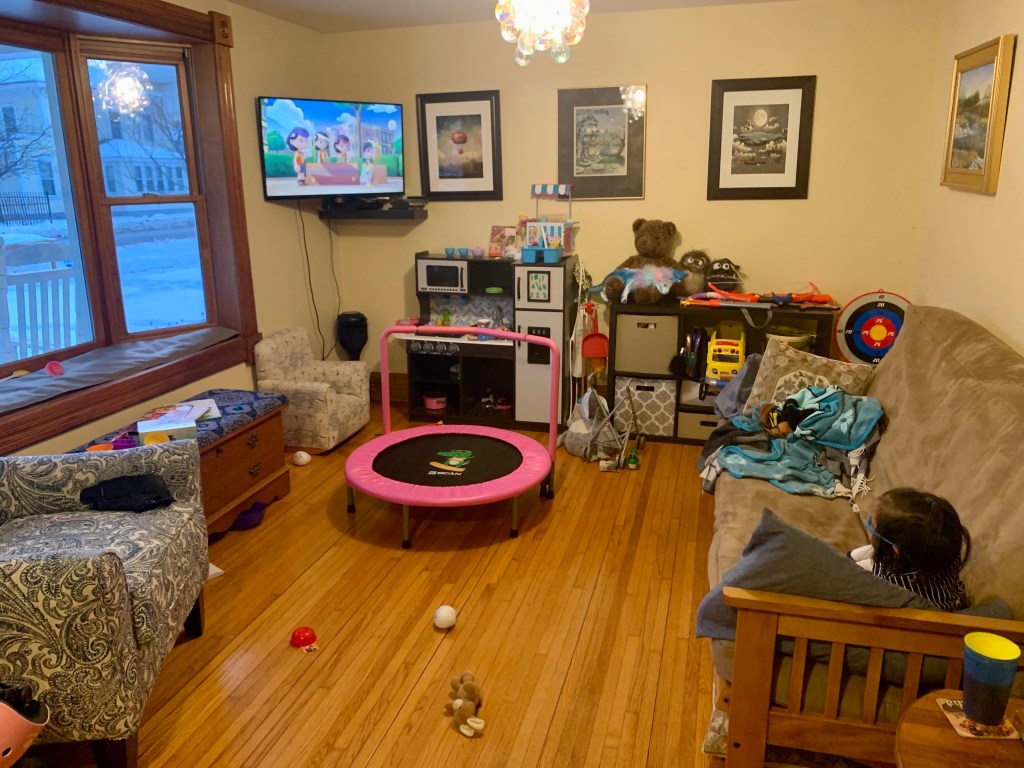 There’s a trampoline in the middle of the room, and an ancient futon for a couch. There’s a play kitchen and a storage rack and bins stuffed full of toys. The artwork in there is lovely, but overall it’s been claimed by the small humans who share our home with us. Entering it endangers the soles of your feet (tiny plastic dinosaurs and legos and suction cup arrows and wooden blocks often litter the floor). And sitting on the futon or chair means getting dragged into a game of “eat what I make you in the kitchen” or “Mommy, watch how high I jump on the trampoline!”