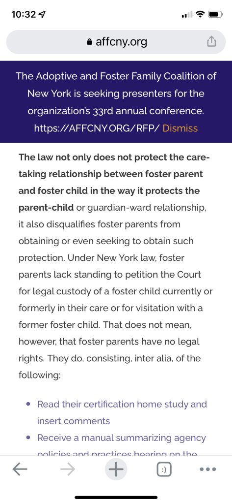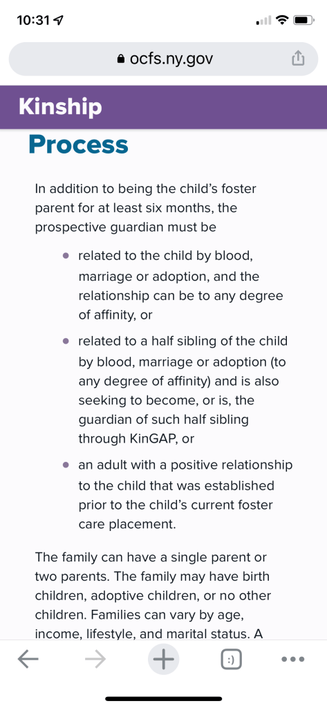 There is a law that prohibits foster parents from petitioning for custody of children in their care. This does make sense to me because we don’t want foster parents trying to circumnavigate the foster care system and get legal custody of children who would otherwise potentially be returned to their parents. But it sucks in this circumstance where what we are trying to do is ethical. We are trying to prevent legal severing of the family ties.