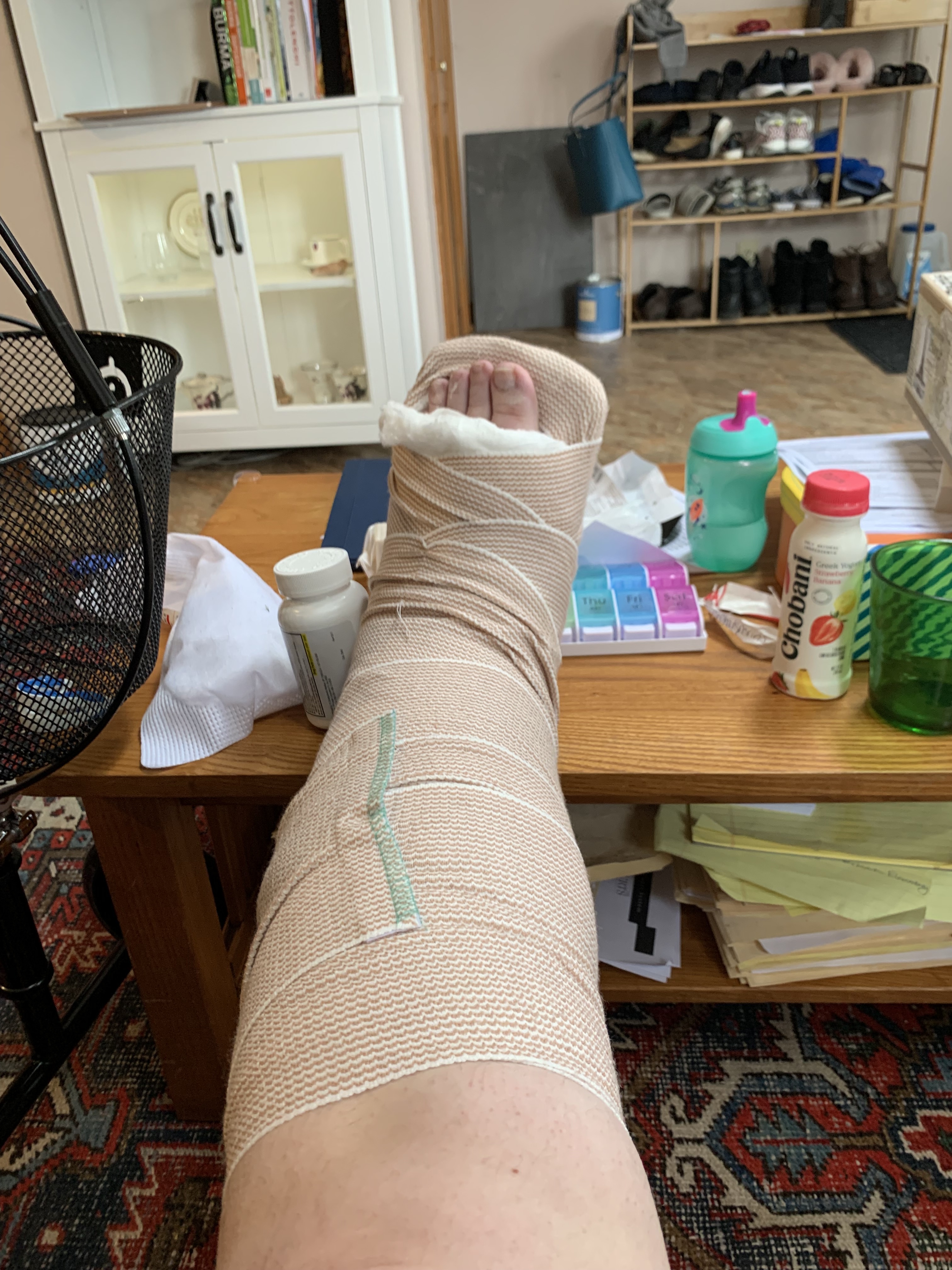 Attractive though it is, it is not giving me miraculous walking powers. I’m still on crutches, and using them for about half my weight, and using a knee scooter to get around the house to avoid having to deal with crutches all the time. I’m sure I’d be doing better if I weighed less – I’m trying to put significant lbs on it. I’m pretty miserable honestly, because I can’t do anything around the house. I have ADHD, and can’t get up and pick up the house and clean and organize and do all the usual things I do to address my urge to move. Frankly, I’m downright cranky. Am I making progress? Surely I am. I can go a little further now walking with the crutches than I could a week ago. But this recovery process ain’t a picnic. Or maybe it is a picnic, but one with mosquitoes and ants and bad food and a sudden downpour.