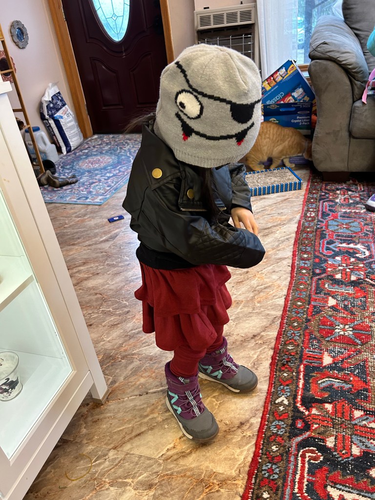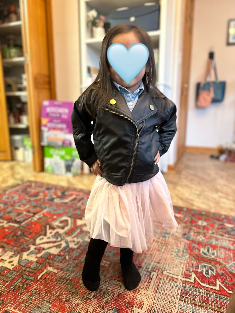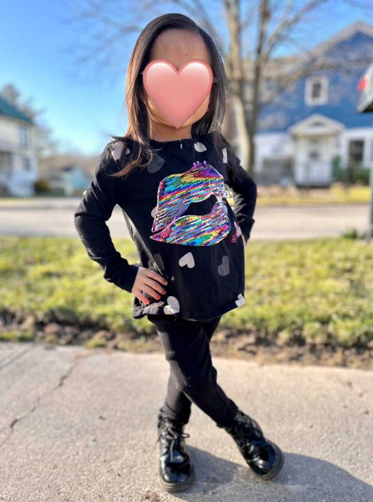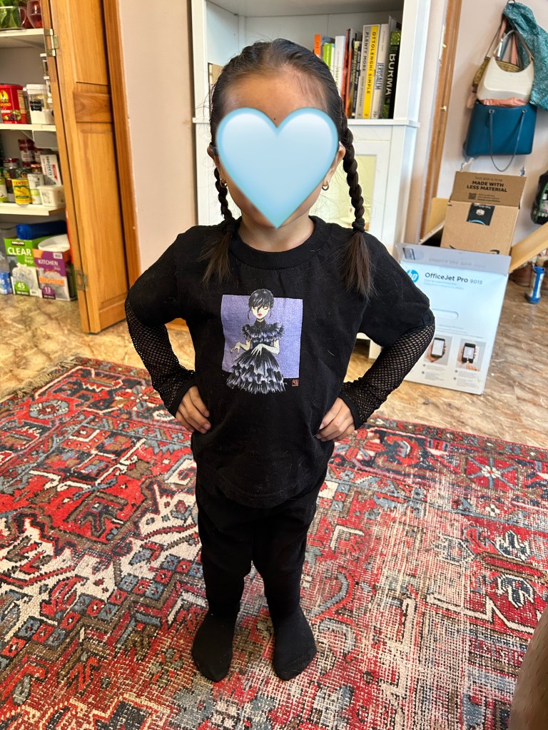 Sprout’s fashion sense is highly developed and powerful. She’s opinionated and insistent about what she’s going to wear. Right now I’m adoring her emo phase. She’s 4 years old and is serious about her black. Ask her her favorite color and she’ll tell you it’s black. In the morning, she’ll ask to wear black, or will pick out something colorful with a tutu and pair it with black combat boots and a black pleather jacket. It’s absolutely amazing. Her favorite character is Wednesday Addams. Her second favorite is Cat Noir. In class pictures, all the girls are in pink and purple and blue, and there’s my kid on the end, shorter by a head and dressed in black and leopard print with a black bow in her hair.