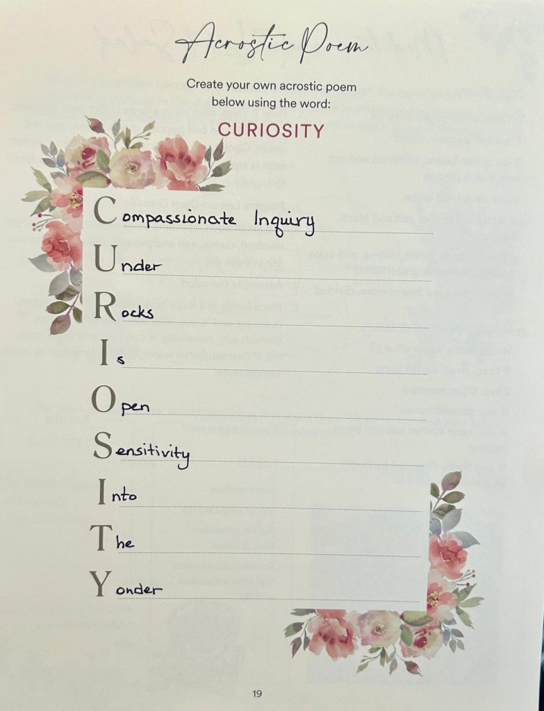 The theme for July’s Silk + Sonder journal is “curiosity,” and one of the pages is an acrostic prompt. When I finished mine I felt like it perfectly captures where I am with my re-discovery of the importance of tuning in to the natural world.