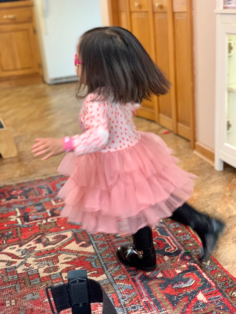 Sprout, dressed for Eid and dancing in circles waiting to leave for visiting her family.