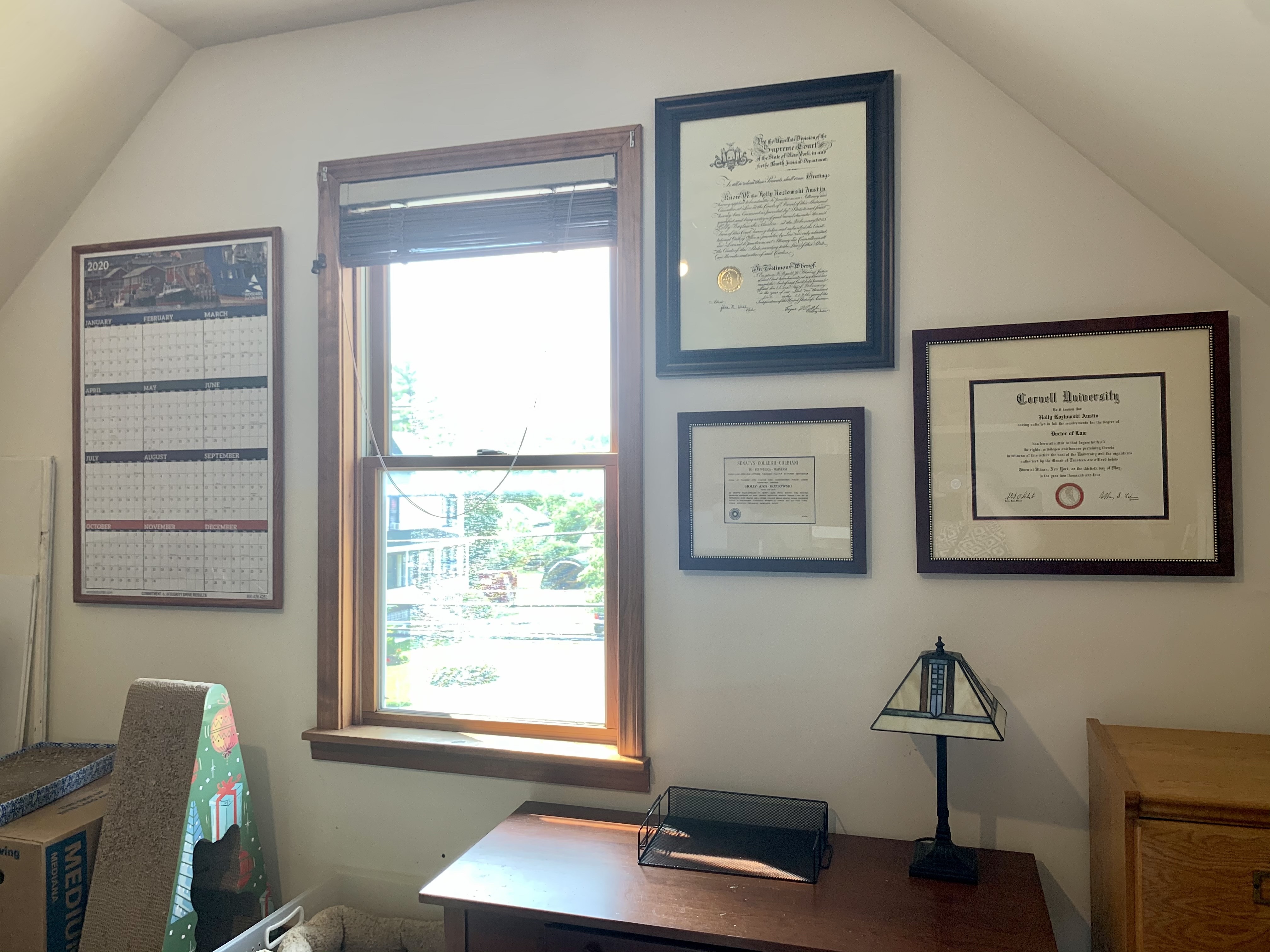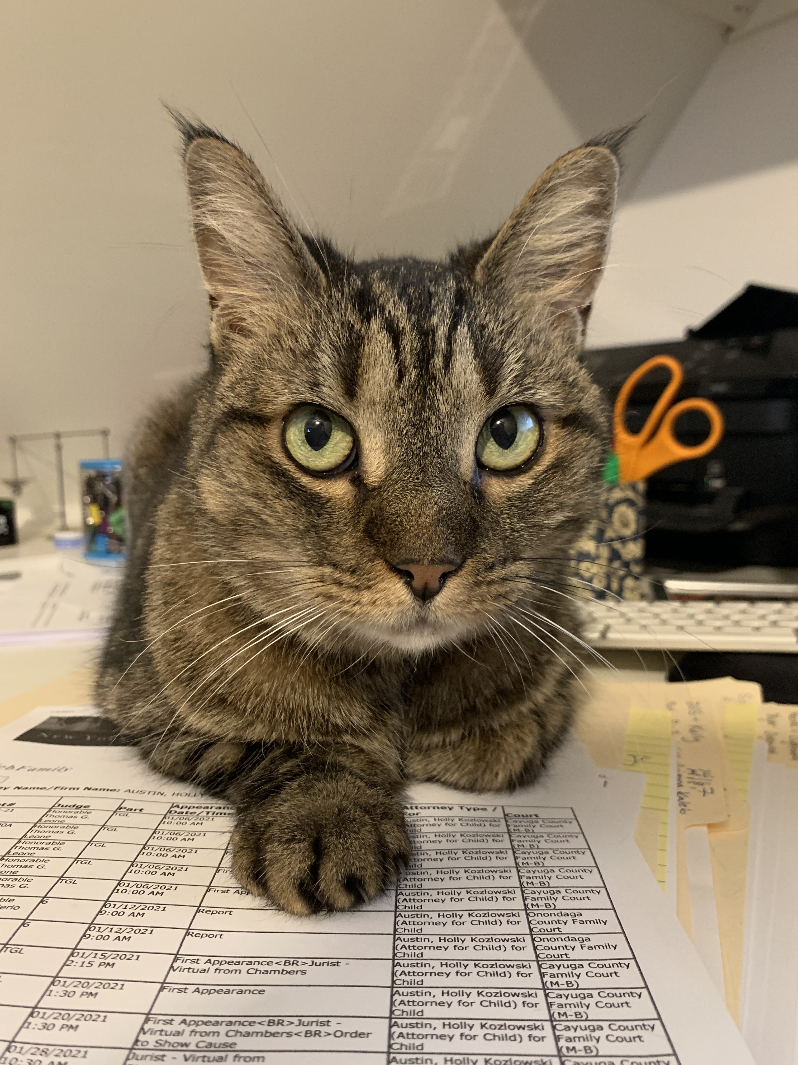 Not too bad aside from the cat scratching tree…Perpetually messy looking shelves behind meMy attic sidekick, Sneakers. She’s always next to me on my papers. She sets her chin on my wrist while I type and purrs until she gets all snotty and starts blowing nose bubbles. It’s disgusting. And she yowls constantly during video court hearings. And I love her.