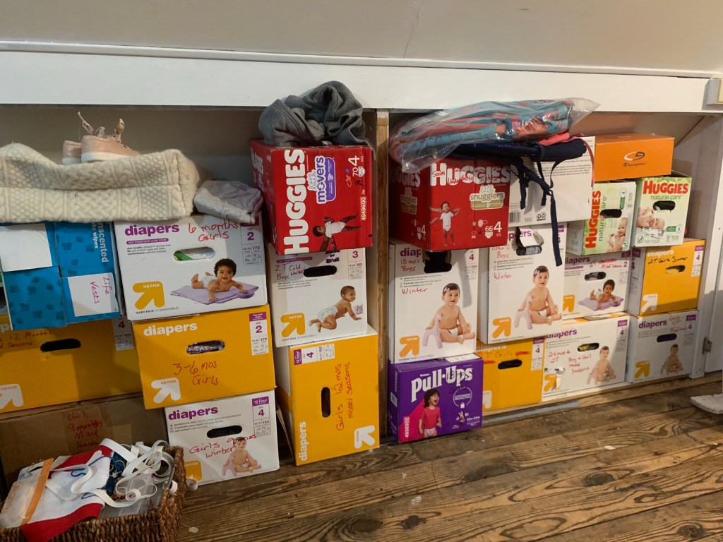 It’s all useful and organized but there’s no getting around the fact that we have an entire wall of our attic eave closets stuffed to the gills with diaper boxes of clothing. People often ask us if our kids need clothing but the little ones never really do because we’ve got so much stashed away.